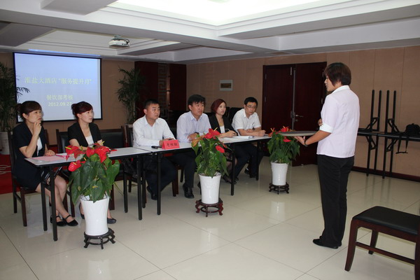 七、八月份的旺季大客情剛過,該酒店伏運(yùn)余總經(jīng)理就召開經(jīng)營管理會議,籌劃在9-12月期間,分別開展“服務(wù)提升月”、“出品質(zhì)量月”、“管理提升月”、“安全生產(chǎn)月”等4個“主題月”活動。要求各部門根據(jù)每月的主題,組織開展活動,進(jìn)一步提高酒店各個方面的工作和接待服務(wù)質(zhì)量,為明年乃至今后的發(fā)展打下堅實基礎(chǔ)。該酒店制定了主題月活動的詳細(xì)工作計劃,以培訓(xùn)為龍頭,帶動全方面服務(wù)提升。在九月份的“服務(wù)提升月”中,部門經(jīng)理及以上管理層直接授課,同時邀請了神州賓館等高星級酒店的管理人員前來授課,共培訓(xùn)120個課時、1000人次。培訓(xùn)真正使員工加強(qiáng)了業(yè)務(wù)知識、提高了服務(wù)意識、開拓了工作思路。(楊帆)