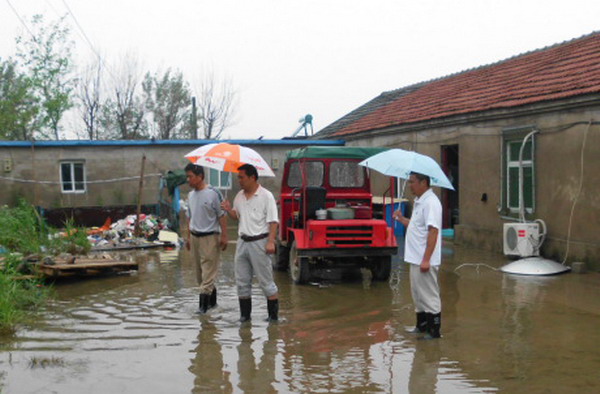7月9日上午一上班,宋跳農場場長趙懷忠?guī)ьI任志明、駱功勛、孫習年、于懷前等同志檢查場區(qū)和居民區(qū)。在整個暴雨過程中,居民區(qū)房屋沒有發(fā)生險情,但地面積水較多,對個別居民用電不符合規(guī)范的,要求立即整改。清源水泥制品廠的石棉瓦大棚局部有坍塌危險,該場當時就下發(fā)整改通知單,限期7月20日前完成。農戶棉花地局部受淹,農田積水于當天下午基本排掉。場區(qū)基本沒有積水,但辦公室在暴雨過程中有漫水現象。職工上班后,清掃辦公室衛(wèi)生,陸續(xù)恢復正常辦公。(任志明)