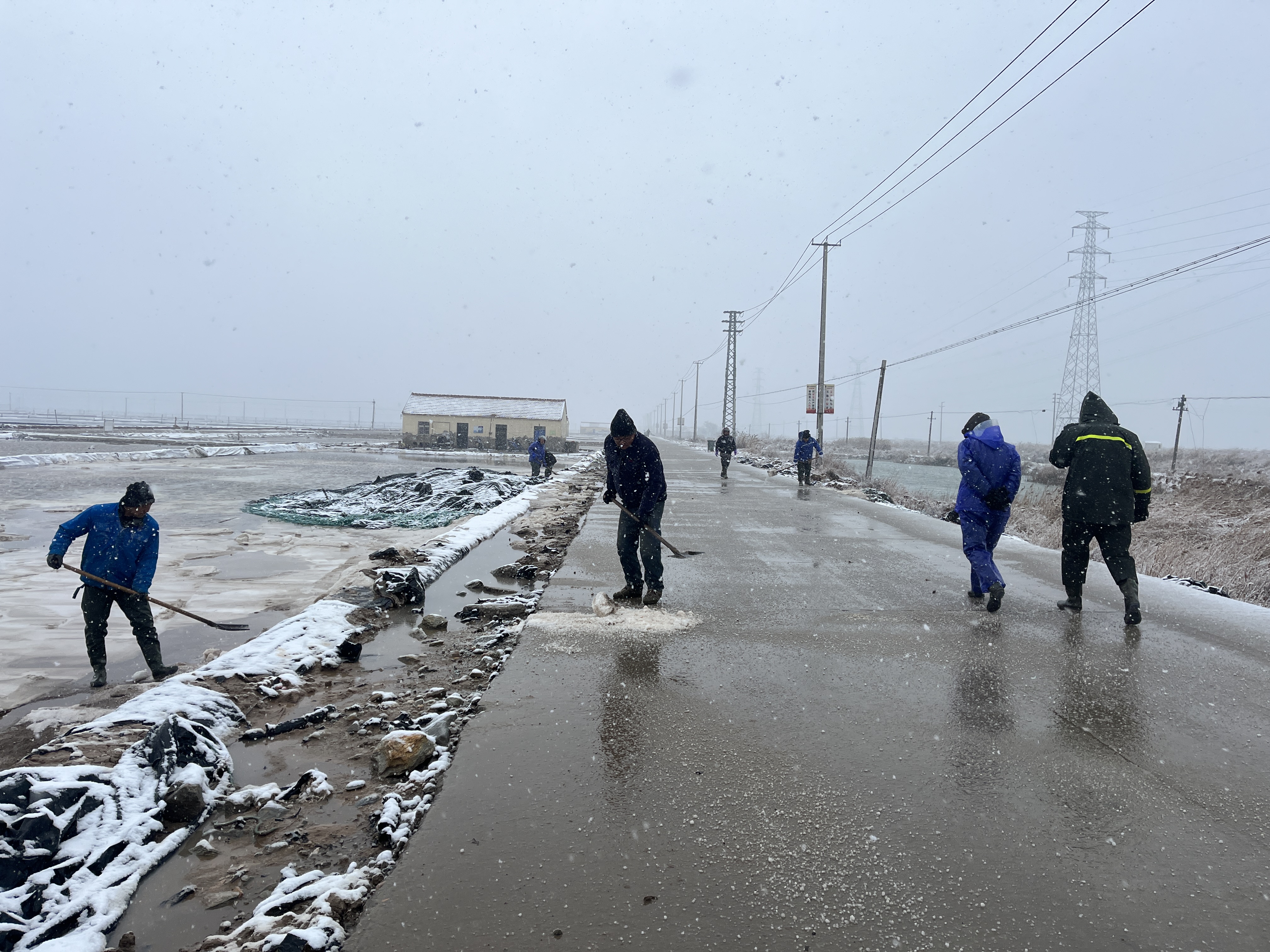 以雪為令,全力奔赴清雪戰(zhàn)一線。隨著降雪量增大,采取“人工+機械”的作業(yè)方式,使用自產原鹽融雪劑對轄區(qū)中二圩居民點、鹽灘內部道路、辦公區(qū)域等20余條主次干道不間斷地毯式清雪除冰作業(yè)。清雪現(xiàn)場,大家不畏嚴寒,積極行動,鏟的鏟、推的推,干得熱火朝天,開辟出一條方便群眾出行的“安全路”。截止目前,已累計出動車輛30余臺次,300余人次參與清雪除冰行動,確保職工群眾“雪中通行,雪后路清”。