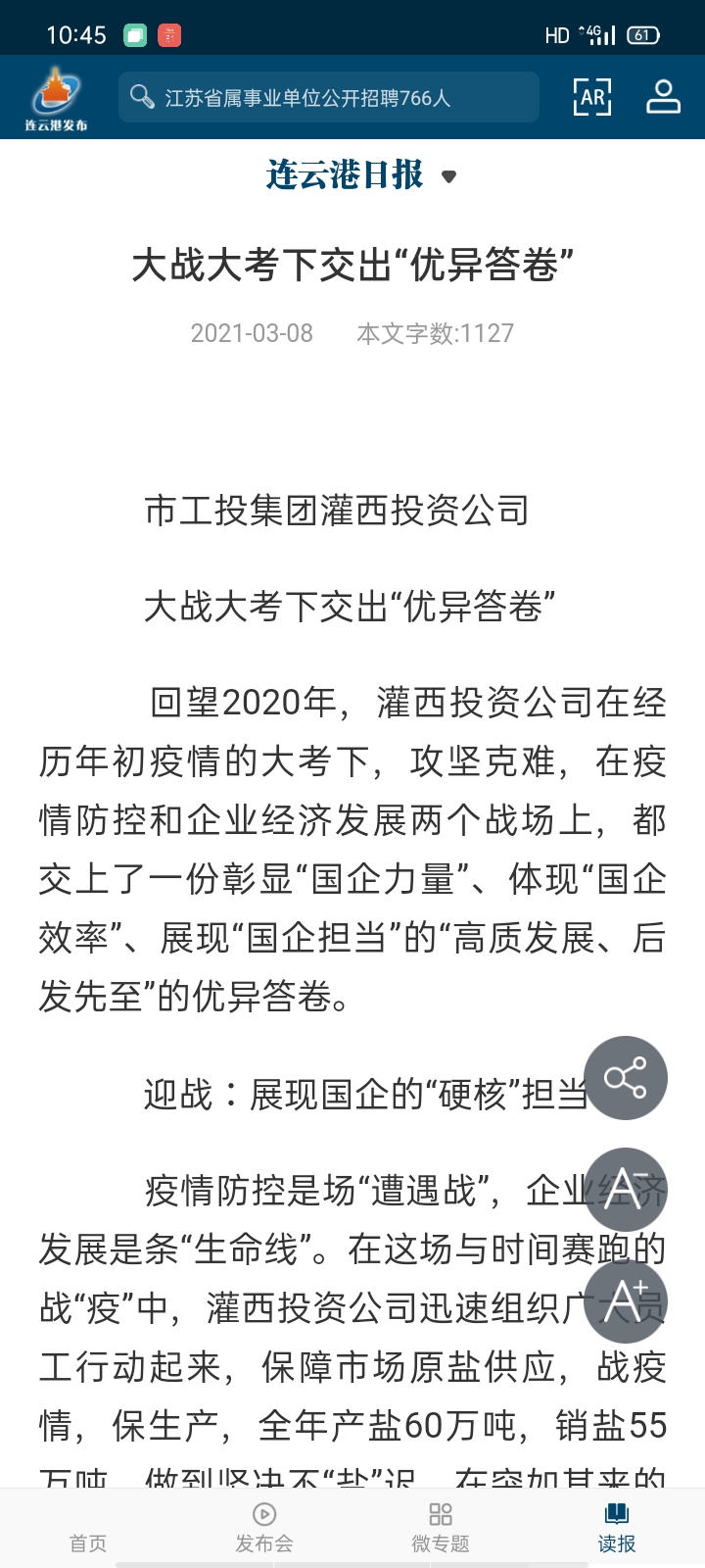 疫情防控是場(chǎng)“遭遇戰(zhàn)”,企業(yè)經(jīng)濟(jì)發(fā)展是條“生命線”。在這場(chǎng)與時(shí)間賽跑的戰(zhàn)“疫”中,灌西投資公司迅速組織廣大員工行動(dòng)起來(lái),保障市場(chǎng)原鹽供應(yīng),戰(zhàn)疫情,保生產(chǎn),全年產(chǎn)鹽60萬(wàn)噸,銷鹽55萬(wàn)噸,做到堅(jiān)決不“鹽”遲。在突如其來(lái)的疫情大考面前,通過(guò)在“家門口”搭建招聘平臺(tái),“點(diǎn)對(duì)點(diǎn)”推送用工信息,為應(yīng)聘人員“量身”定崗,招聘因疫情管控失業(yè)人員83人,同時(shí)為臨港產(chǎn)業(yè)區(qū)輸送轉(zhuǎn)崗職工70余人,讓因疫情管控還沒(méi)有出門打工的灌西社區(qū)本地人員在家門口上班,穩(wěn)住了復(fù)工復(fù)產(chǎn)的“陣腳”,以“硬核”擔(dān)當(dāng),護(hù)航企業(yè)經(jīng)濟(jì)復(fù)蘇。