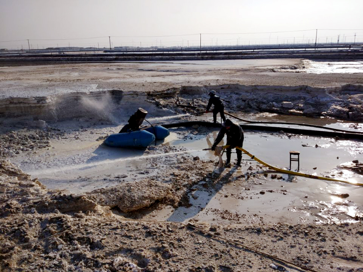 來到埒南制鹽分公司6班硫酸鈣清理現(xiàn)場,只見水槍里射出的水柱把硫酸鈣廢渣沖的四處飛濺,伴隨機(jī)器轟鳴聲硫酸鈣廢液被送出灘外,工友們穿好雨衣,戴好頭盔,手握水槍,一站就是3、4個小時,他們兩人一組,輪番作業(yè),確保息人不息機(jī)。班長胡繼華信誓旦旦的說我們要發(fā)揚(yáng)一不怕苦,二不怕累的革命精神,發(fā)揚(yáng)“有條件要上,沒有條件創(chuàng)造條件也要上”的大慶精神,寧愿多加班,少睡覺也要按期保證完成硫酸鈣清理工作。
