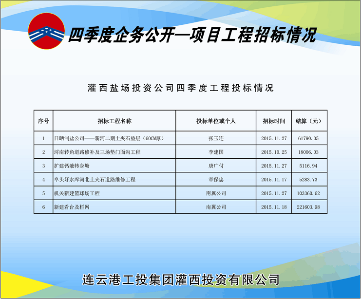 第四次是在11月27日招標(biāo)項(xiàng)目是:1、機(jī)關(guān)新建籃球場(chǎng)工程,參加投標(biāo)價(jià)分別為:靳國(guó)兵107390.5元、楊磊106522.51元、南翼公司105841.03元,攔標(biāo)價(jià)為111115.92元,中標(biāo)價(jià)為南翼公司105841.03元。2、日曬制鹽公司新河二期土夾石墊層(60CM厚),參加投標(biāo)價(jià)分別為:張玉連58477.11元、靳國(guó)兵59708.20元、楊磊59092.66元,攔標(biāo)價(jià)為61790.05元,中標(biāo)價(jià)為張玉連58477.11元。3、擴(kuò)建鈣液轉(zhuǎn)身塘工程,參加投標(biāo)價(jià)分別為:唐廣付5260.63元、徐飛5371.38元、史祥燕5316元,攔標(biāo)價(jià)為5537.5元,中標(biāo)價(jià)為唐廣付5260.63元。
