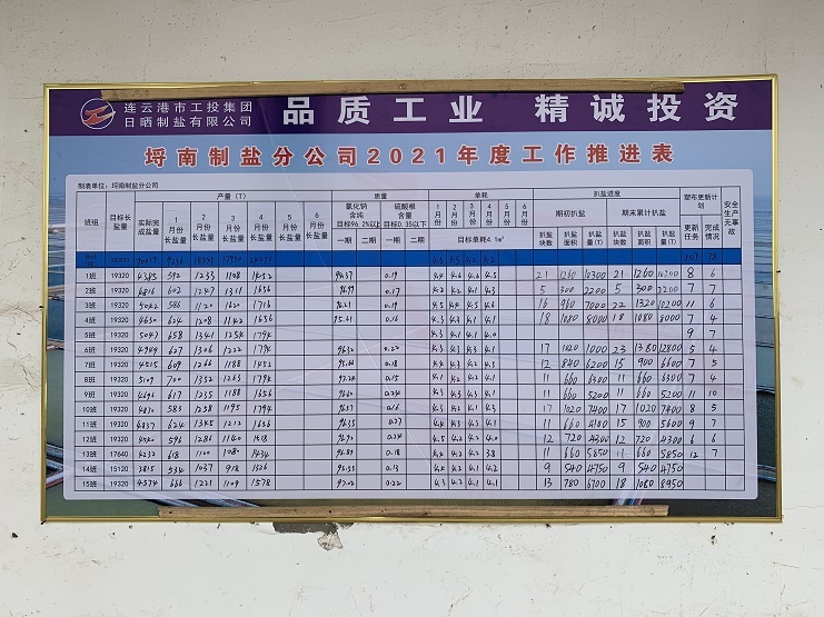 張貼二季度工作推進(jìn)表,清晰的反映出目前的原鹽產(chǎn)量、質(zhì)量、單耗、以及春季扒鹽情況。分公司經(jīng)理程龍要求各個片區(qū)負(fù)責(zé)人按照表上反映的數(shù)據(jù),查漏補(bǔ)缺,強(qiáng)化生產(chǎn)工作。在提高單產(chǎn)、降低單耗上下功夫,強(qiáng)化“三雨操作”,加強(qiáng)結(jié)晶管理,嚴(yán)格除硫生產(chǎn)工藝,充分利用粉鹽化鹵,下馬格、副廩基等有效面積窮制鹵水,最大限度地降低鹵耗,提高單產(chǎn),加快扒鹽進(jìn)度、強(qiáng)化扒鹽產(chǎn)量保證安全工作。
