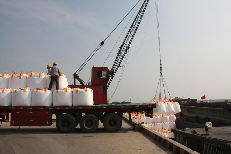 4月30日上午9時許,隨著一聲汽車長笛,一輛載有近40噸化工物資的卡車徐徐??吭谙笪锪鞴疚骞嗪哟a頭邊,緊接著碼頭鐵臂起舞,機械操作工嫻熟地操縱著塔吊機械,準(zhǔn)確地將一包包噸貸物資裝卸在碼頭邊的貨船中。。。。。。自此,一輛輛滿載40余噸貨物的卡車源源不斷向碼頭駛來。