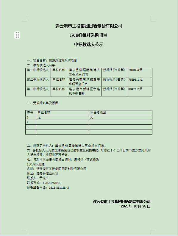 連云港市工投集團日曬制鹽有限公司玻璃纖維桿采購項目中標(biāo)候選人公示