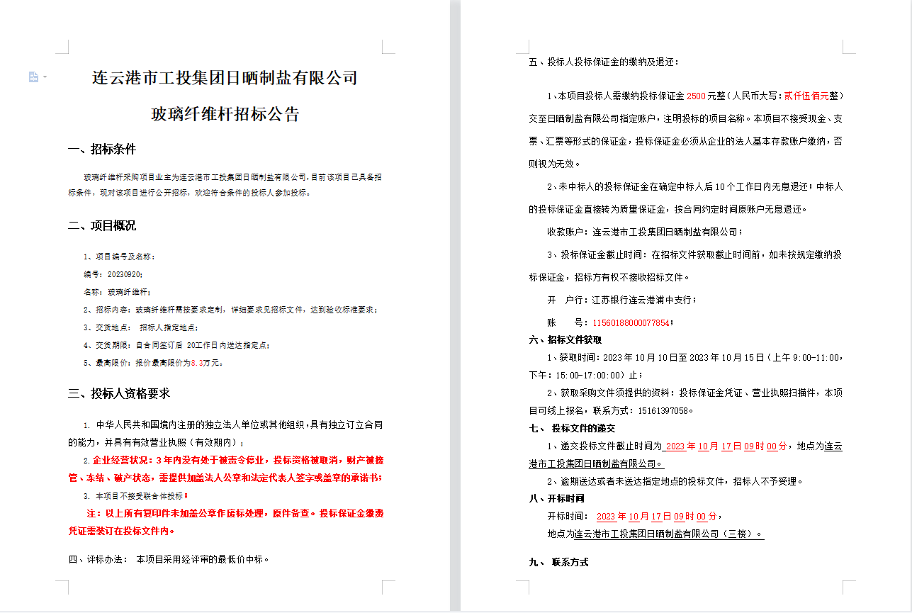 連云港市工投集團日曬制鹽有限公司 玻璃纖維桿招標公告