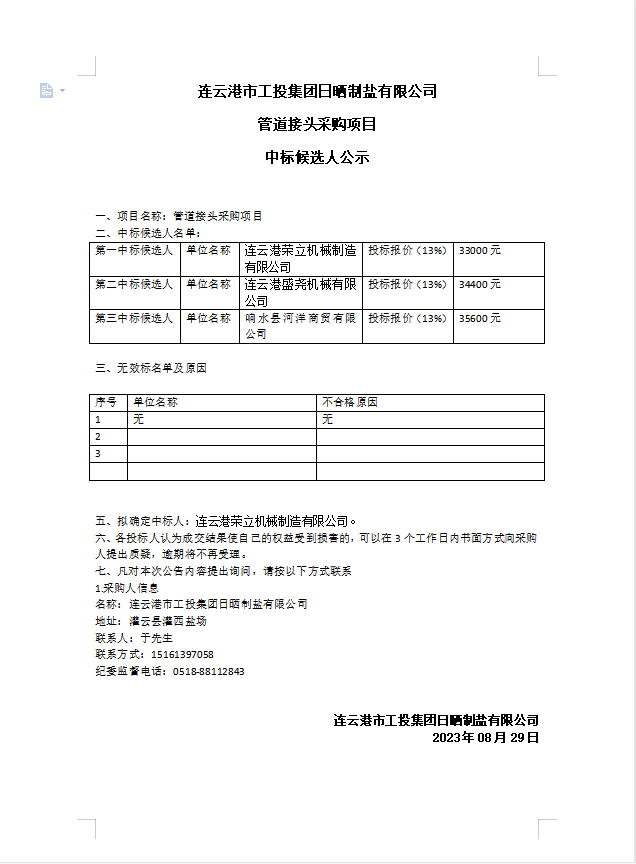 連云港市工投集團(tuán)日曬制鹽有限公司 管道接頭采購項目中標(biāo)候選人公示