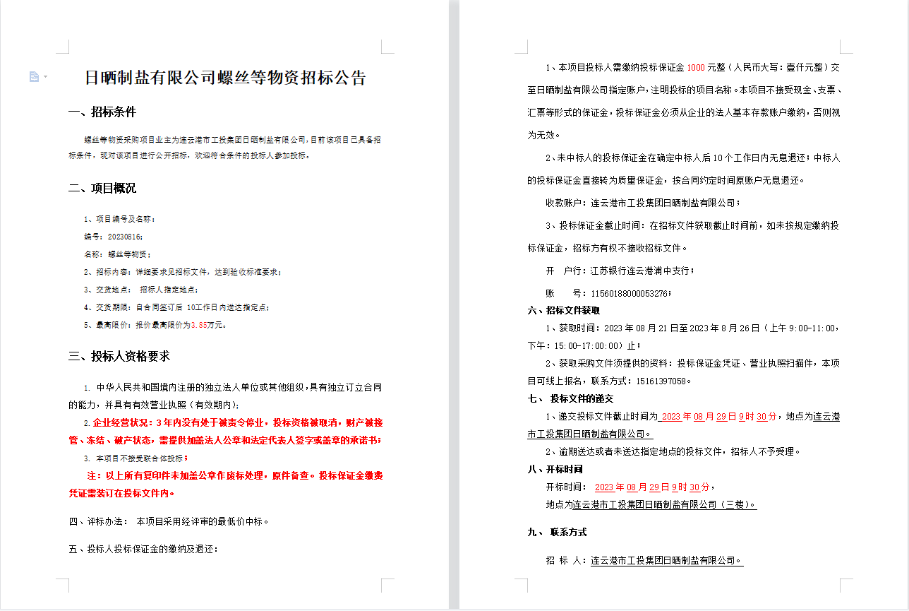 日曬制鹽有限公司螺絲等物資招標(biāo)公告