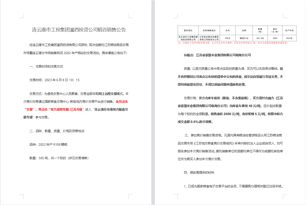 連云港市工投集團(tuán)灌西投資公司稻谷銷售公告