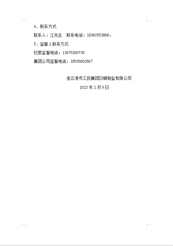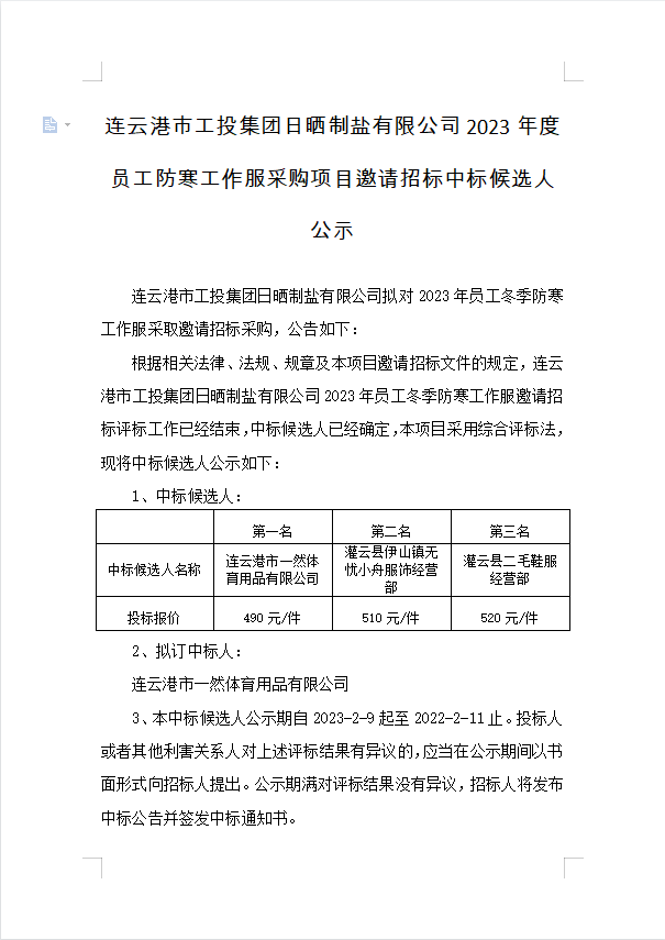 連云港市工投集團(tuán)日曬制鹽有限公司2023年度員工防寒工作服采購項目邀請招標(biāo)中標(biāo)候選人公示