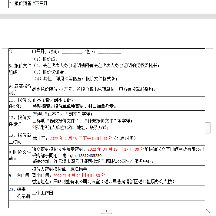 密封報(bào)價(jià)開啟時(shí)間及地點(diǎn):2022年04月21日前,如有特殊情況時(shí)間另行通知。