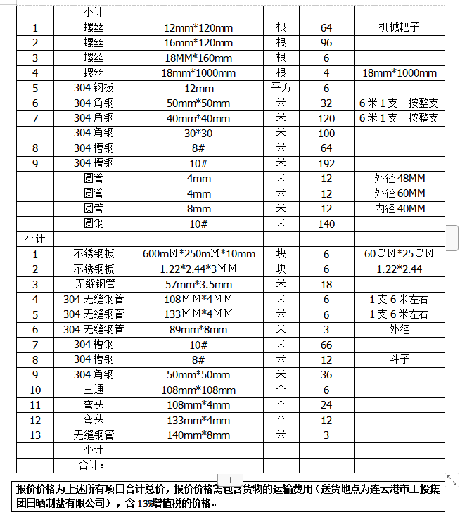 單價(含13%稅、運(yùn)輸費(fèi)用)。合同期間304不銹鋼單價不以304不銹鋼市場單價的變動而作任何調(diào)整。