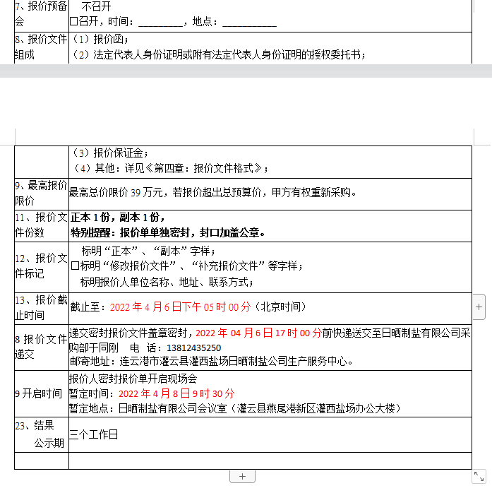密封報價開啟時間及地點(diǎn):2022年04月8日前,如有特殊情況時間另行通知。