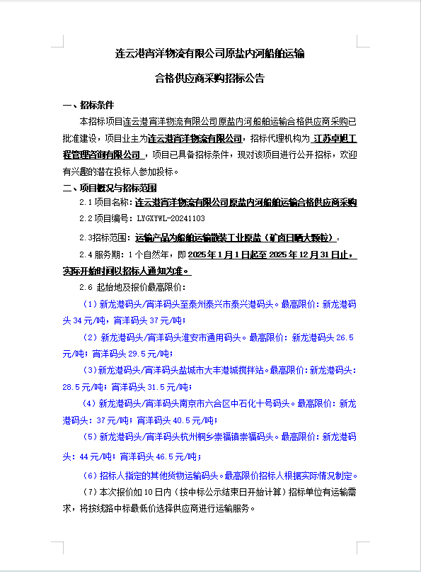 連云港宵洋物流有限公司原鹽內(nèi)河船舶運(yùn)輸合格供應(yīng)商采購招標(biāo)公告