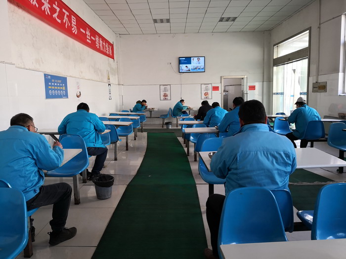 職工分區(qū)域、分時段,保持距離就餐,餐廳電視宣傳疫情防控知識