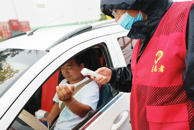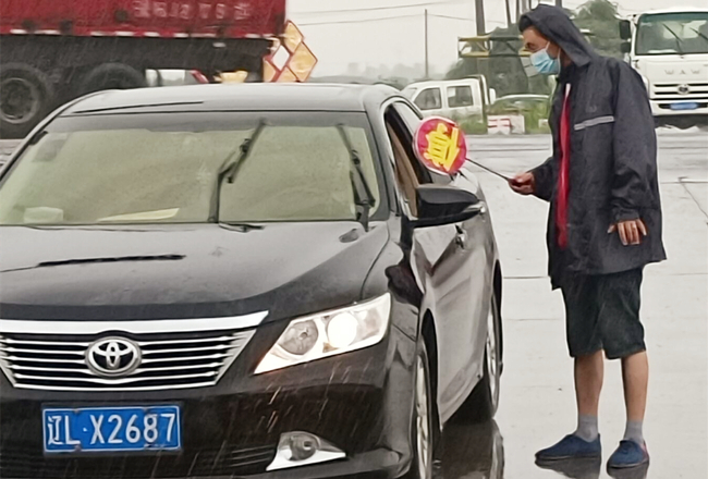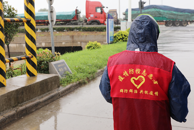 “您好,請出示一下行程碼,做下登記?!眻允卦趰徫?,逆風(fēng)迎雨,對車輛進(jìn)行逐一登記和體溫檢查,絲毫沒有受天氣的影響。