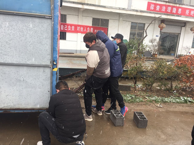 公司黨委書記、董事長胡傳法冒雪檢查成業(yè)飼料卡口,胡書記囑咐在現(xiàn)場值班的團青干部防控一線,要動真格不能含糊,堅決不給外來車輛通過。負責(zé)這里還有生產(chǎn)生活服務(wù)中心和黃沙分場的全體管理干部,大家都很辛苦,但沒有埋怨,都在默默地堅守崗位,履行職責(zé)。“你不站崗我不站崗,誰保衛(wèi)咱大場”他們是這樣說也是這樣做的。為了讓值守人員有一個溫暖的臨時休憩的場所,泰祥公司將一個臨時集裝箱拉到卡口,后勤班的小伙子們,搬運調(diào)試固定,絲毫沒有因為寒冷的天氣影響工作進度。