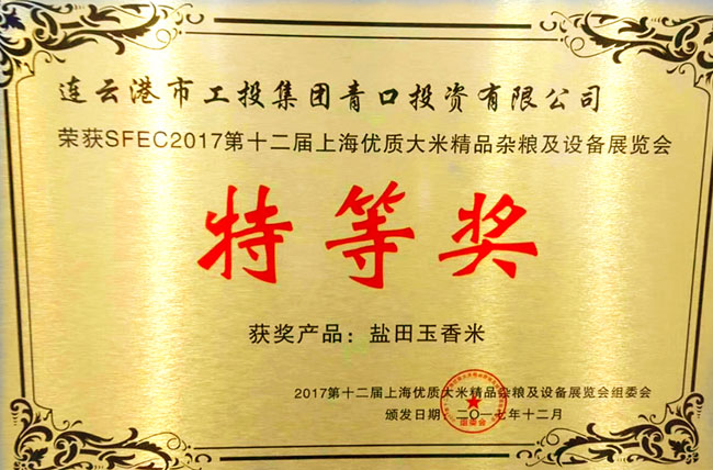 2017第十二屆上海優(yōu)質大米及精品雜糧展覽會,我公司“鹽田玉”大米榮獲特等獎,這是繼江蘇好大米稱號之后的又一重大殊榮。