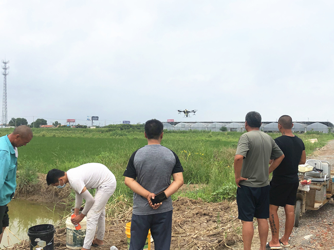 拿起遙控傳感器,把控路線,按下起飛按鈕,無人機(jī)按照操控徐徐升起,平穩(wěn)地向稻地飛去。幾分鐘后掉頭飛回,折返噴灑,規(guī)律地重復(fù)……隨著螺旋槳的轉(zhuǎn)動(dòng),機(jī)身下的噴淋頭噴出霧化農(nóng)藥,均勻地噴灑在油綠的水稻上。