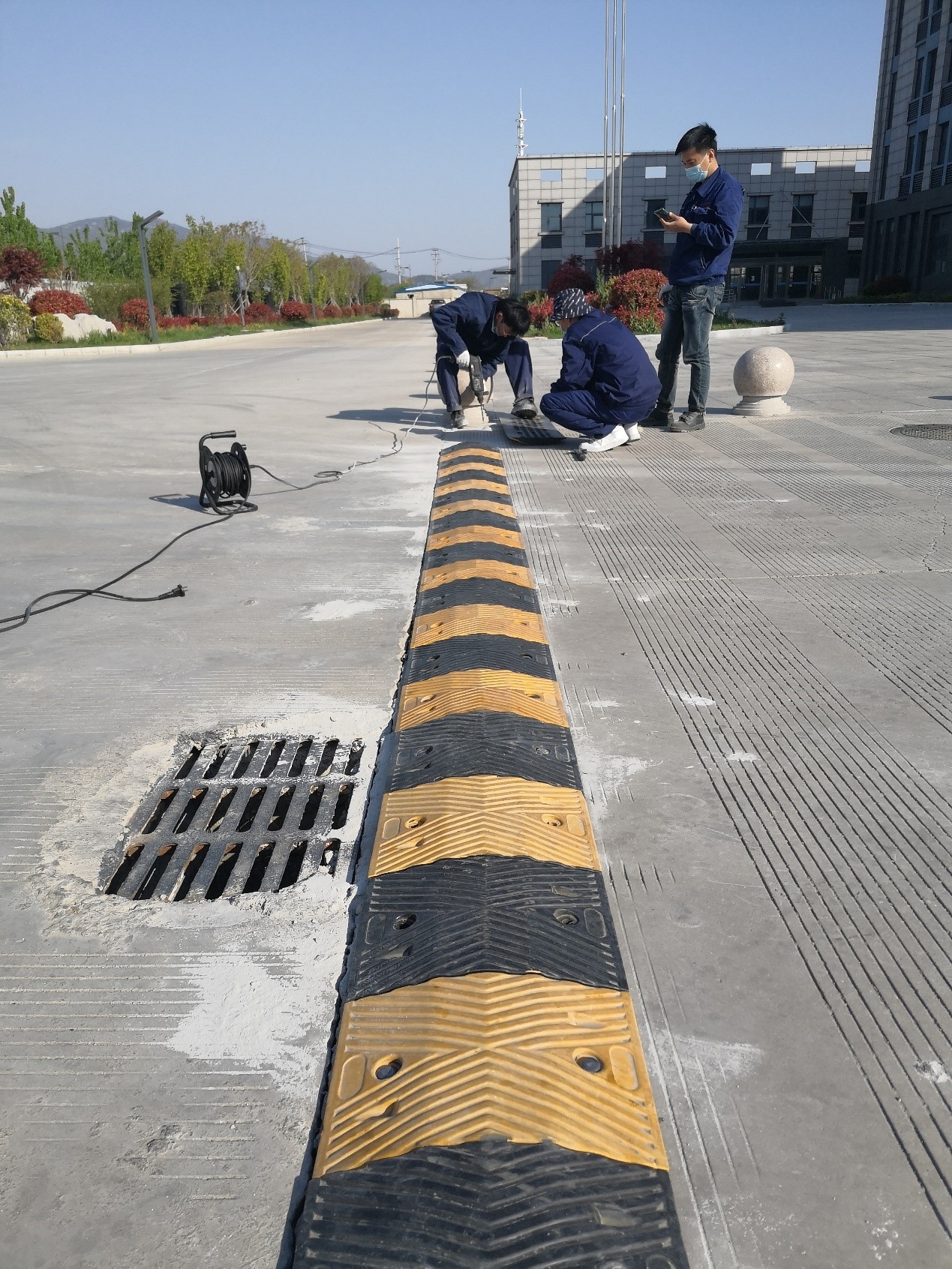 為了強化道路交通安全,公司在廠區(qū)主大門入口和停車場兩處加設(shè)減速帶。圖為安全管理部員工在現(xiàn)場施工。