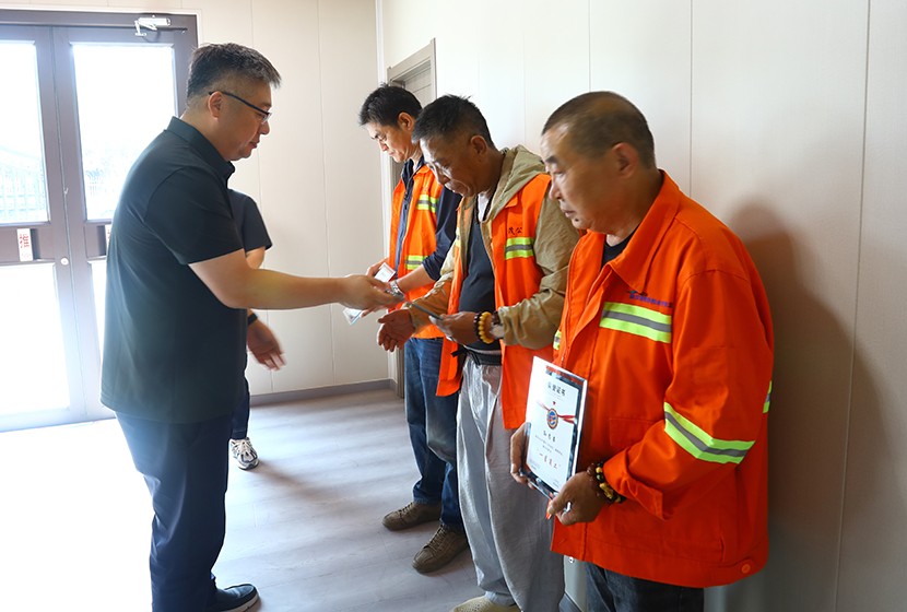 此次頒獎(jiǎng)打破傳統(tǒng)集中表彰模式,將頒獎(jiǎng)臺(tái)搬到生產(chǎn)建設(shè)最前沿,公司領(lǐng)導(dǎo)班子成員親自前往光伏安康驛站、創(chuàng)智綠園、大浦片區(qū)、云橋路施工現(xiàn)場(chǎng)、佟圩路施工現(xiàn)場(chǎng)、益豐園林園區(qū)6個(gè)一線點(diǎn)位,為獲獎(jiǎng)員工頒發(fā)榮譽(yù)證書(shū),并送上暖心祝福。當(dāng)公司領(lǐng)導(dǎo)將“星級(jí)員工”證書(shū)遞到員工手中時(shí),獲獎(jiǎng)?wù)唠y掩激動(dòng):“這份榮譽(yù)既是肯定,更是責(zé)任。我會(huì)繼續(xù)扎根基層,為臺(tái)北(華茂)貢獻(xiàn)全部力量!”