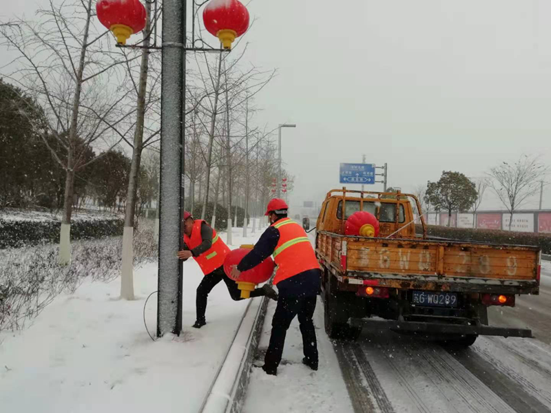 一夜的狂風(fēng)暴雪將花果山大道路上的亮化燈籠刮掉不少,該項工程是翔立分公司今年承接開發(fā)區(qū)市政第一個亮化工程,安裝維護質(zhì)量的好壞決定著這該項目工程的能否持續(xù)承接。帶著一份堅守、心懷責(zé)任、更帶著翔立轉(zhuǎn)型發(fā)展的希望,“鐵軍”們一大早就已經(jīng)整裝待發(fā),奔赴施工現(xiàn)場收集整理燈籠。