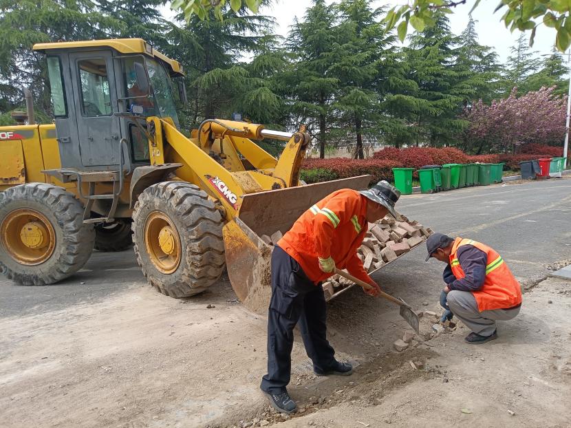 項(xiàng)目開工前,盛達(dá)市政分公司召開中科院提升改造專項(xiàng)會(huì)議,根據(jù)各單項(xiàng)工程落實(shí)安全生產(chǎn)責(zé)任制,分班組劃片區(qū),并對(duì)隱蔽工程、交叉作業(yè)項(xiàng)目制定專項(xiàng)施工方案。該項(xiàng)目工期僅 30 天,由于工期緊,任務(wù)重,施工人員正在開足馬力搶時(shí)間、趕進(jìn)度,在項(xiàng)目施工現(xiàn)場(chǎng),原道磚清除、舊電纜拆除、新建道路基礎(chǔ)墊層、路牙石鋪設(shè)等各施工任務(wù)同步開展,挖掘機(jī)、裝載機(jī)、貨車等各種工程車輛有序穿梭,各施工現(xiàn)場(chǎng)圍擋、指示牌、路錐等擺放規(guī)范,人員工作服、安全帽等穿戴整齊,確保安全文明施工。