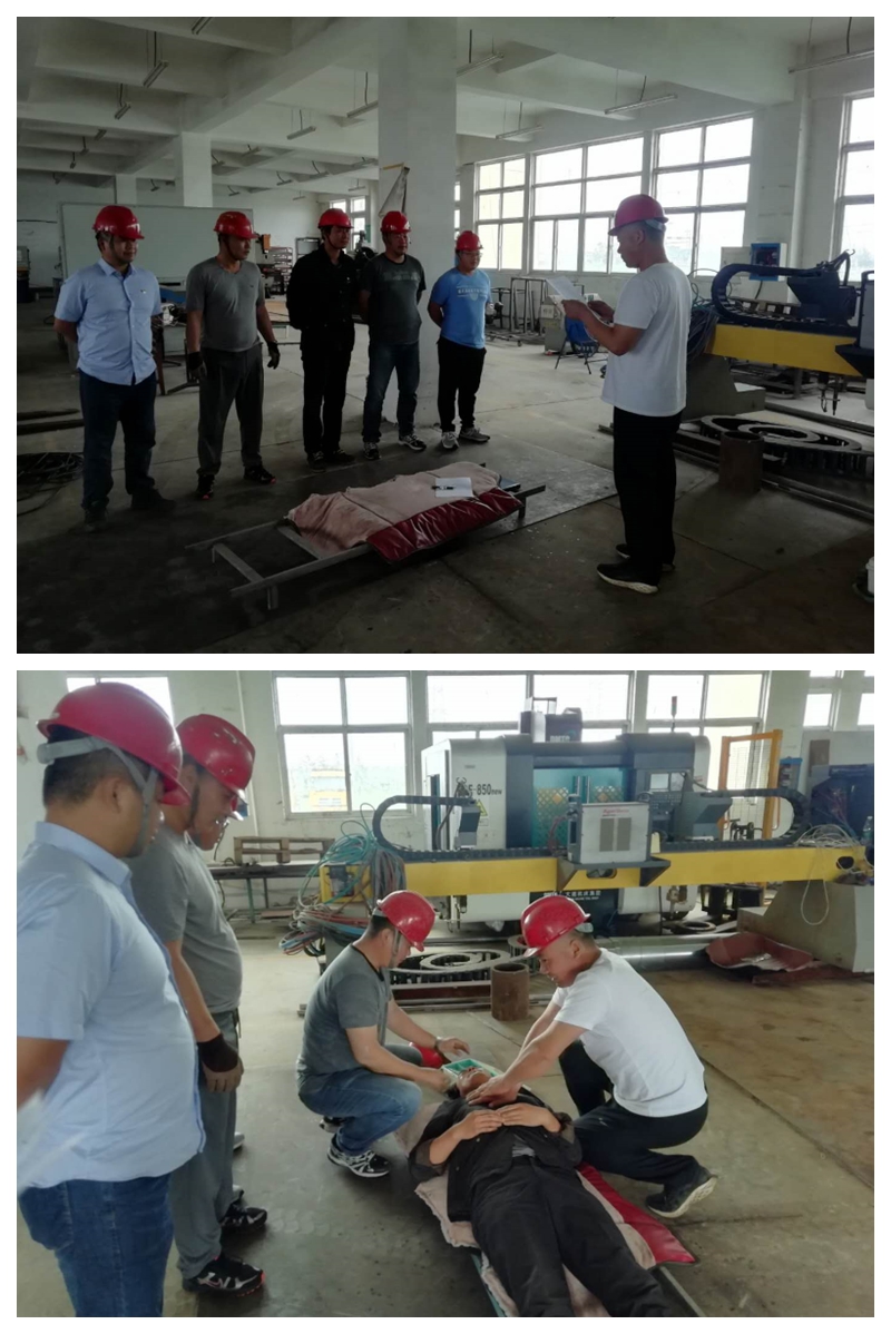 本次演練方案模擬在精工車間正常生產(chǎn)過程中,因對電氣設備沒有經(jīng)常性檢查,液壓切板機切板時掉落的鋼板未采取防范措施將電氣電纜砸斷搭鐵,造成液壓切板機金屬外殼帶電,作業(yè)人員在正常操作機床時造成觸電事故傷害。當同事發(fā)現(xiàn)有人觸電后,立刻做出救援反應,切斷電源將觸電人員安全隔離開后抬到擔架上進行搶救。并同時上報應救援指揮組,指揮組迅速做出響應,啟動防觸電應急預案,大家按應急預案的分工迅速開展救援工作,撥打120急救電話、拉警戒線、查看傷情、緊急搶救、人工心肺復蘇等,直至觸電者蘇醒,在大家的共同協(xié)作下演練圓滿成功,翔立分公司湯占國總經(jīng)理對此次演練效果進行了總結和點評。