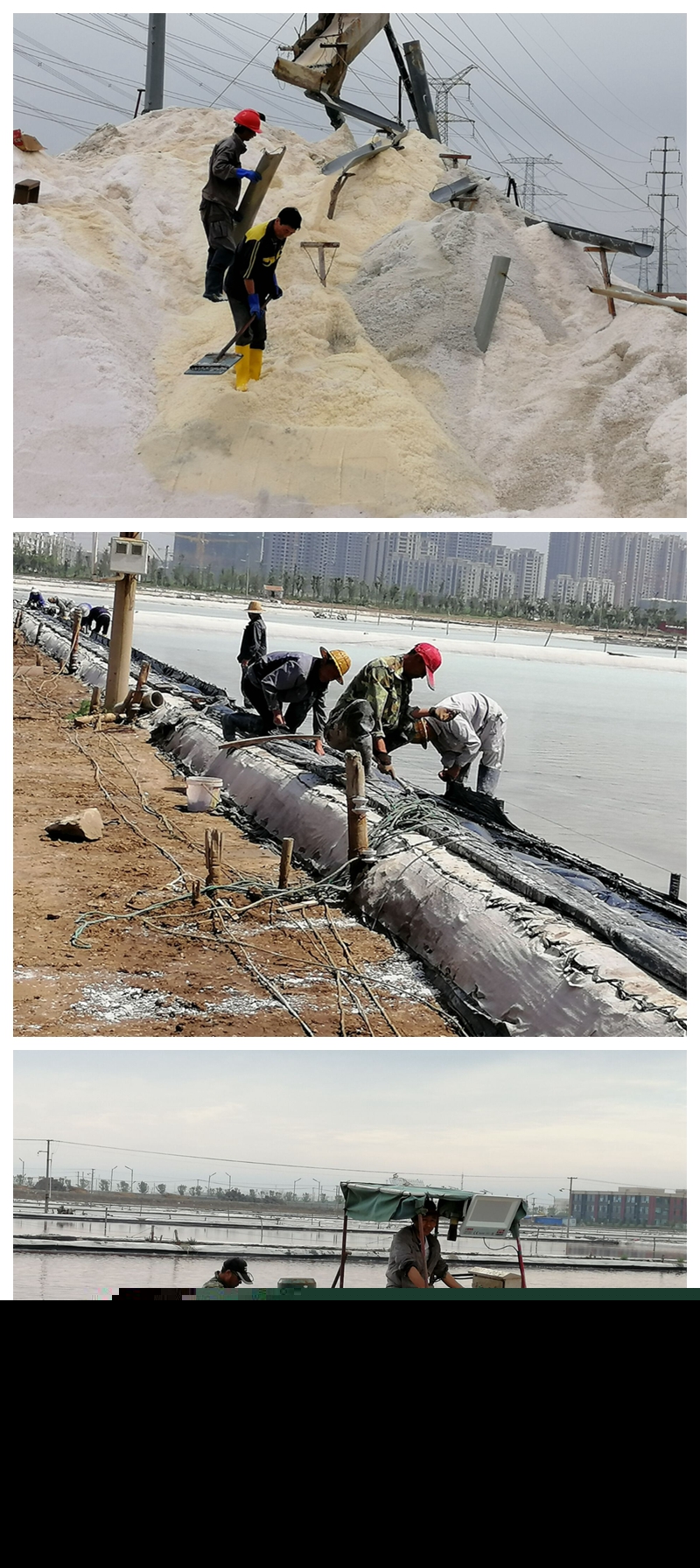 沒有參加扒鹽的人員也沒閑著,他們將工作重心轉(zhuǎn)移到苫布保鹽工作中來,苫鹽廩布、整理樁繩、修補、拉放塑布,對存鹽廩基等區(qū)域進行疏通加固,以及扒鹽后有序推進灘場文明等等。特別是東灘,為了盡早完成1680公畝的灌池任務(wù),至三月初以來,工人們起早貪黑、放棄節(jié)假日克服一切困難,經(jīng)過多方共同努力現(xiàn)已灌池1200多公畝,預(yù)估池內(nèi)長鹽已達8000多噸。面對雨季即將到來之際,各單元在保證鹽色、鹽質(zhì)做好安全扒鹽的同時,抓住晴好天氣強化大面積制鹵,加大走水深度和節(jié)制,充分利用蒸發(fā)量多制鹵、制好鹵為順利度過汛期做好一切準(zhǔn)備。