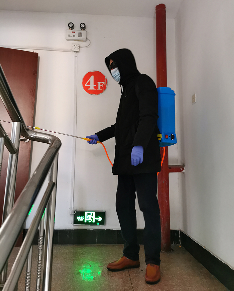 義務(wù)消毒,沒有報(bào)酬,得隨時(shí)待命,看起來是應(yīng)者寥寥的苦差。在昌圩湖職工小區(qū)和公司機(jī)關(guān)大樓,卻穿梭著這樣的身影。他們背著裝滿消毒液的噴壺,穿梭在社區(qū)街道和辦公場所,把消毒液噴灑的每一處