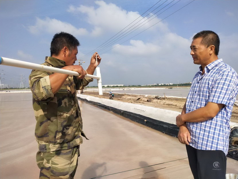 上圖為礦鹽生產(chǎn)顧問王緒前在現(xiàn)場(chǎng)指導(dǎo)測(cè)量鹵水波美度及相關(guān)數(shù)據(jù)