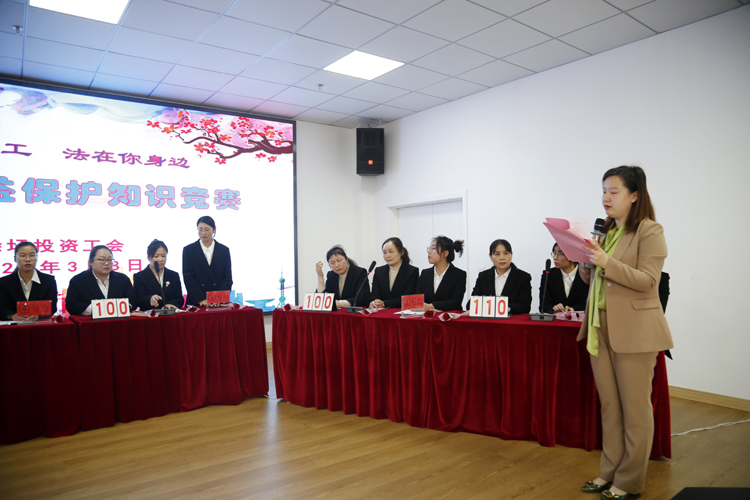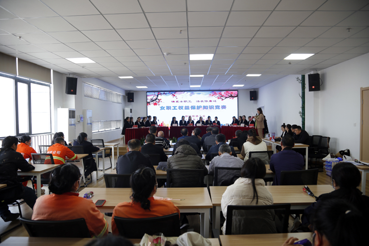 3月8日,投資公司工會(huì)在環(huán)衛(wèi)運(yùn)營管理中以“情系女職工 法在你身邊”為主題,舉辦 “女職工權(quán)益保護(hù)”知識(shí)競(jìng)賽。投資公司黨委書記、董事長(zhǎng)、總經(jīng)理莊清付,黨委副書記、工會(huì)主席劉剛,副總經(jīng)理?xiàng)钍孛?,各單位黨政工、工會(huì)女工委成員、悅升機(jī)關(guān)全體員工觀摩比賽。