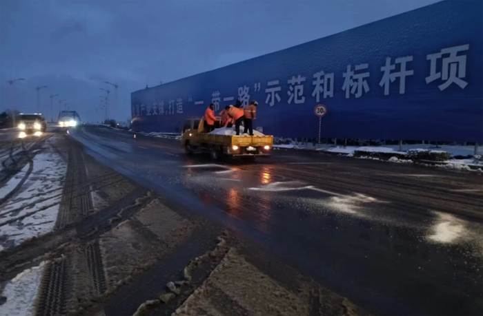 此次掃雪除冰行動共40余人參與,調(diào)派鏟雪車、裝載機等機械設備5臺,調(diào)用融雪劑30余噸,采用人機結合方式,對主要干道人行便道、交叉路口等重要地段的路面冰雪進行人工突擊清理;對所轄干道的橋面采用先雪鏟車清理,后鋪灑融雪劑相結合融化冰雪,循環(huán)進行。