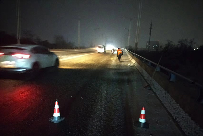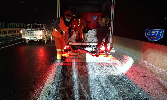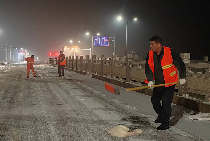 該公司除雪突擊隊由總經(jīng)理徐習華和副總王利分頭帶隊指揮,集結了安全部、管養(yǎng)部、綠化、保潔、市政、環(huán)衛(wèi)的突擊隊員80余名,出動5輛皮卡車、3輛皮卡、1臺裝載機和2輛巡查車,主要負責新區(qū)內(nèi)橋梁、連云開發(fā)區(qū)橋梁、徐新路、疏港大道、228省道等主要交通干道布撒融雪劑抗凍救災工作。突擊隊員在進行融雪劑撒布作業(yè)的同時,及時清理路面融化雪水,防止再次結冰,各除雪設備配合作業(yè),階梯式向前推進,提高除雪效率。(李敏 王宜全)