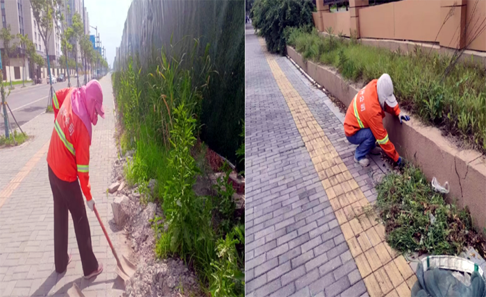 ? ? ? 道路保潔“無所畏懼”。 黑色柏油馬路上,熱浪滾滾,橙色工作服在強烈陽光照耀下顯得格外引人注目。女子班,228班組保潔人員在班長龔飛、姚功帶領下,肩背除草機,雙手緊握長長的操作手柄,高速旋轉的打草帶,將雜亂草葉打斷、甩開,不一會,就“收割”上海路生活區(qū)周邊雜草20多處;人工清掃裝運施工車輛拋灑石子、泥土30余車,擦洗站臺座椅30多個,清掏果皮箱200余只,盡心盡職完成突擊保潔任務。